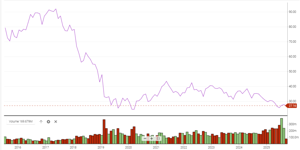 Here’s a chart of Kraft/Heinz’ stock price–symbol KHC– over the past 10 years, since the merger. Doesn’t require a lot of interpretation, does it? The people have spoken, and loudly.
